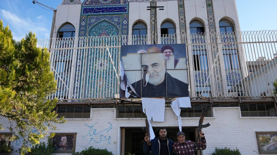 ছবি: ৮ ডিসেম্বর, ২০২৪-এ সিরিয়ার দামেস্কে ইরানের দূতাবাসের ক্ষতিগ্রস্ত প্রবেশপথের সামনে আসাদ বিরোধী যোদ্ধারা দাঁড়িয়ে আছে। ছবি: হোসেন মাল্লা