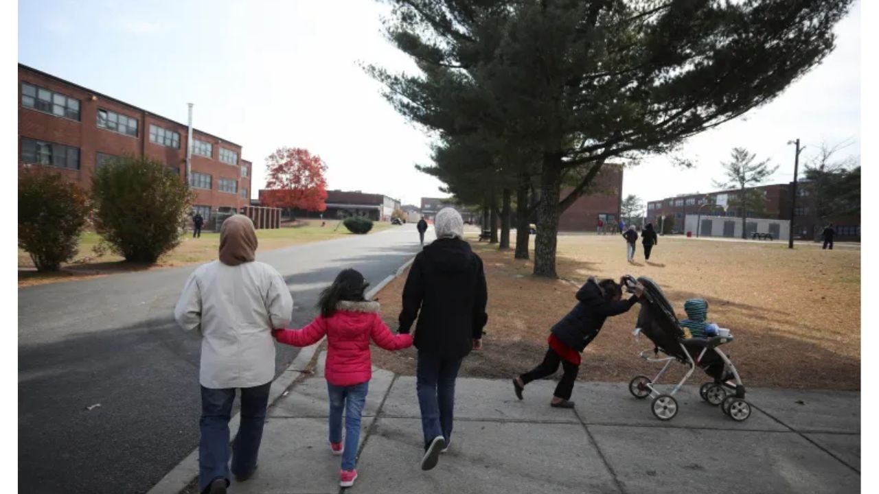 একজন আফগান শরণার্থী পরিবার নিউ জার্সিতে অস্থায়ী বাসস্থানের পাশ দিয়ে হাঁটছে, ছবি: রয়টার্স