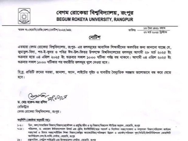 বিশ্ববিদ্যালয়ের রেজিস্টার ড. মোঃ হারুন-অর রশিদ স্বাক্ষরিত নোটিশ