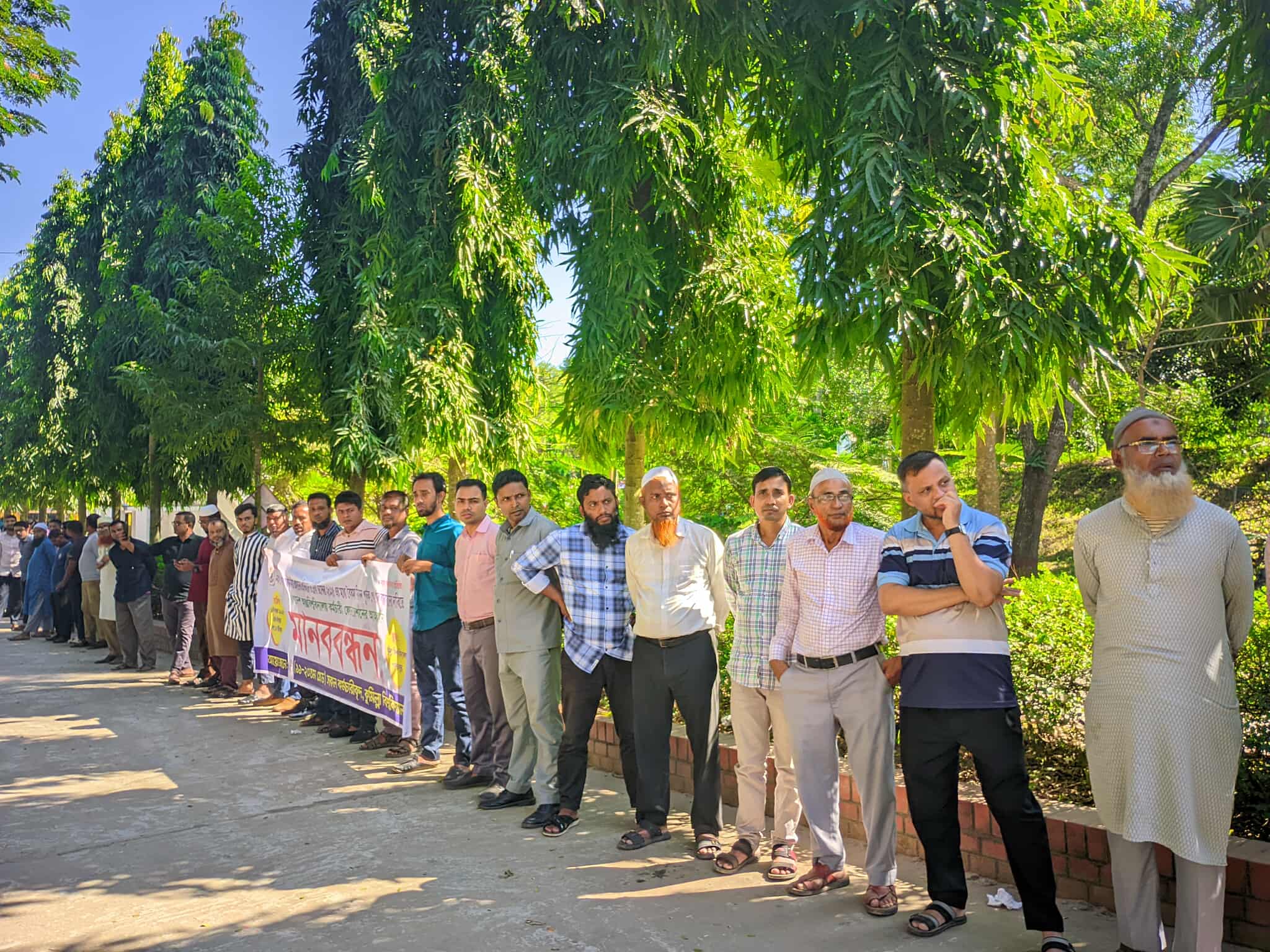 মানববন্ধনে গণিত বিভাগের কম্পিউটার অপারেটর এ কে এম কামরুল হাসান বলেন, “দুর্নীতিমুক্ত বাংলাদেশ গড়ার পরিকল্পনা থাকলে কর্মচারীদের বেঁচে থাকার নিশ্চয়তা আগে দিতে হবে। পেট খালি থাকলে মানুষ দুর্নীতিতে জড়ানোর ঝুঁকি বেশি থাকে।” তিনি আরও অভিযোগ করেন যে সরকার পে কমিশন গঠন করলেও অর্থনৈতিক অজুহাতে তা কার্যকর করা হচ্ছে না। একে তিনি “রাষ্ট্রীয় সম্পদ লুটপাটের সম্ভাব্য ফাঁদ” বলেও উল্লেখ করেন।