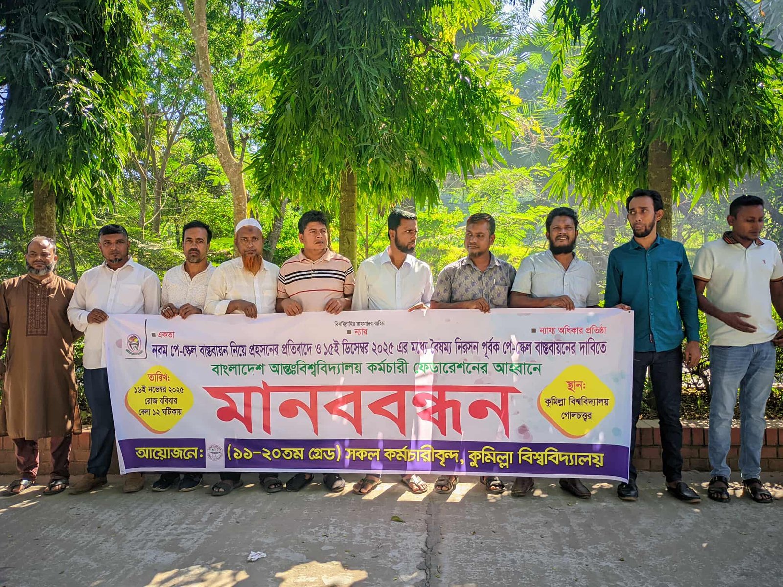নবম পে-স্কেল বাস্তবায়নের দাবিতে কুবিতে কর্মচারীদের মানববন্ধন
