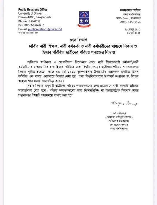 হিজাব-নিকাব বিষয়ে ঢাবি জনসংযোগ দফতরের বিজ্ঞপ্তি