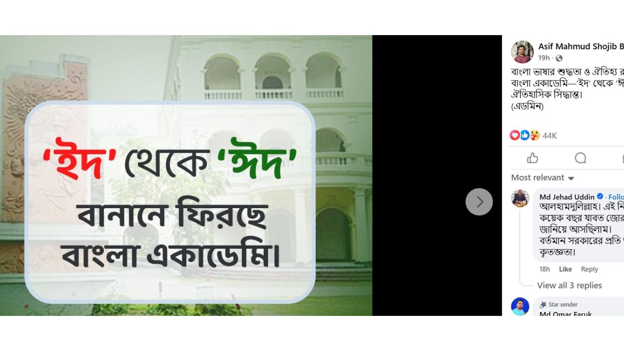 উপদেষ্টা আসিফ মাহমুদের ফেসবুক পেজে ঈদ বানান ফিরিয়ে আনার পোস্ট, ছবি: ফেসবুক