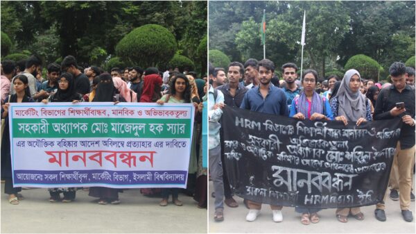 ইসলামী বিশ্ববিদ্যালয়ে (ইবি) জুলাই বিপ্লববিরোধী কর্মকাণ্ডে জড়িত থাকার অভিযোগে সাময়িক বরখাস্ত হওয়া দুই শিক্ষকের বহিষ্কারাদেশ প্রত্যাহারের দাবিতে মানববন্ধন করেছে শিক্ষার্থীরা। বরখাস্ত হওয়া শিক্ষকরা হলেন— মার্কেটিং বিভাগের সহকারী অধ্যাপক মো. মাজেদুল হক এবং হিউম্যান রিসোর্স ম্যানেজমেন্ট বিভাগের সহকারী অধ্যাপক মো. শহীদুল ইসলাম।