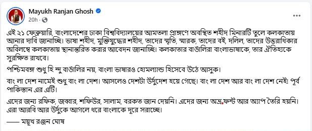 শহীদ মিনার কলকাতায় স্থানান্তরের আবদার করে ময়ূখ পোস্ট করেছে