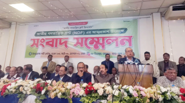 রাজধানীর গুলশানে নতুন রাজনৈতিক জোট ‘জাতীয় গণতান্ত্রিক ফ্রন্ট (এনডিএফ)’ আত্মপ্রকাশ করেছে। সোমবার বেলা ১১টার দিকে গুলশানের ইমানুয়েলস পার্টি সেন্টারে আয়োজিত সংবাদ সম্মেলনের মাধ্যমে জোটটি আনুষ্ঠানিক যাত্রা শুরু করে। আত্মপ্রকাশ অনুষ্ঠানে