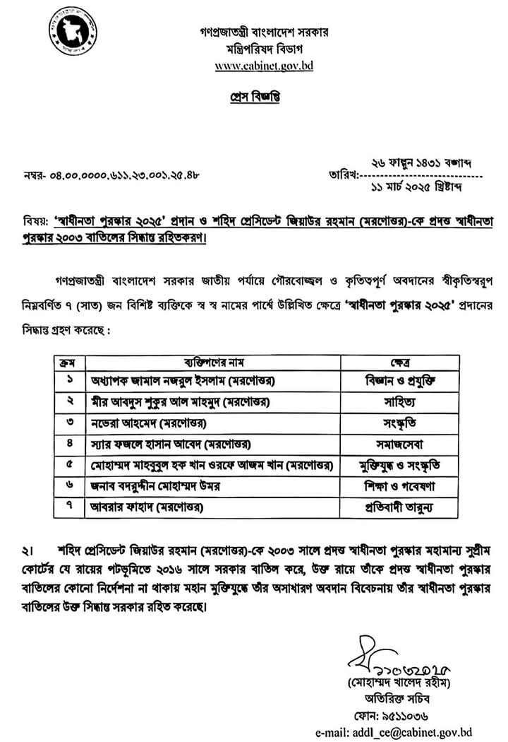 এ বছর স্বাধীনতা পদক প্রাপ্তদের নামের তালিকা