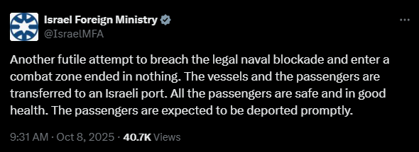 এর আগেও, প্রায় এক সপ্তাহ আগে, ইসরায়েলি নৌবাহিনী ‘সুমুদ ফ্লোটিলা’ নামের একটি আলাদা নৌবহর আটক করেছিল। সেখানে থাকা অন্তত ৪০টি নৌযান ও ৪৭৯ জন অধিকারকর্মীকে ইসরায়েলে নিয়ে যাওয়া হয়। পরে তাদের অনেককে তুরস্ক, গ্রিস ও স্লোভেনিয়ায় পাঠানো হয়। ওই অভিযানে সুইডিশ জলবায়ু আন্দোলনকর্মী গ্রেটা থুনবার্গও ছিলেন বলে আন্তর্জাতিক সংবাদমাধ্যম জানায়।