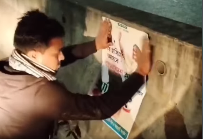 রাস্তার ডিভাইডারে রাতের আঁধারে পোস্টার লাগাচ্ছেন একজন ছাত্রলীগ কর্মী, ছবি: ছাত্রলীগের ভেরিফায়েড ফেসবুক পেজ