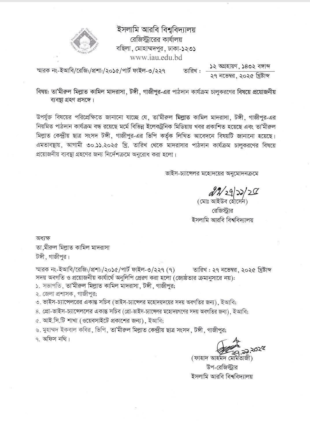 টঙ্গীর তামীরুল মিল্লাত কামিল মাদ্রাসার স্থগিত পাঠদান কার্যক্রম পুনরায় চালুর নির্দেশ দিয়েছে ইসলামি আরবি বিশ্ববিদ্যালয়। আগামী ৩০ নভেম্বর থেকে নিয়মিত ক্লাস শুরু করার কথা উল্লেখ করে বিশ্ববিদ্যালয়ের পক্ষ থেকে ২৭ নভেম্বর রেজিস্ট্রার মো. আইউব হোসেনের সই করা একটি চিঠি মাদ্রাসা কর্তৃপক্ষের কাছে পাঠানো হয়।